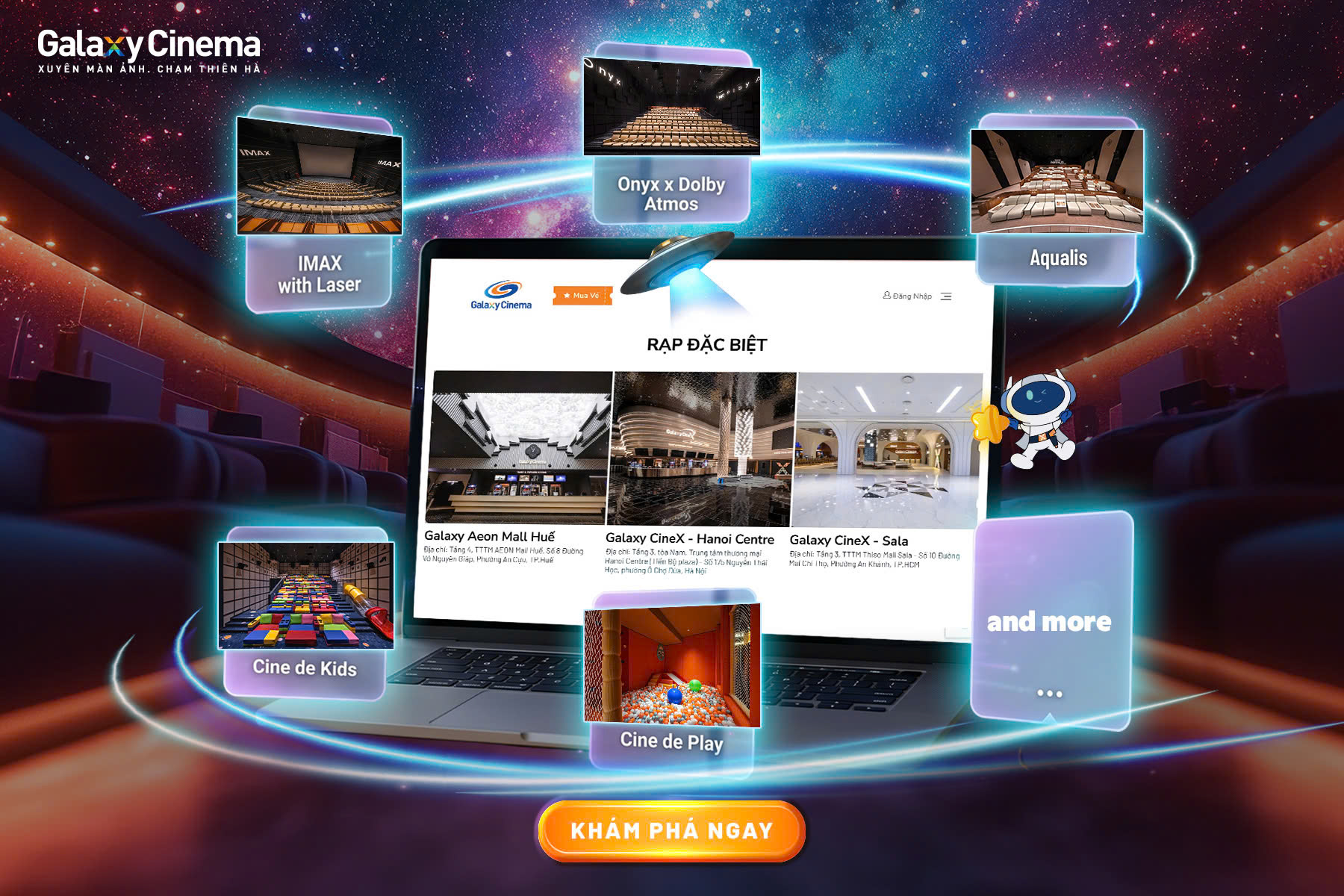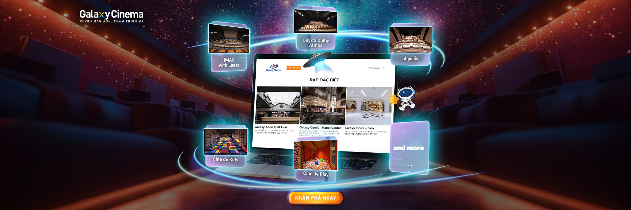 Galaxy Cinema là một trong những công ty tư nhân đầu tiên về điện ảnh được thành lập từ năm 2003, đã khẳng định thương hiệu là 1 trong 10 địa điểm vui chơi giải trí được yêu thích nhất. Ngoài hệ thống rạp chiếu phim hiện đại, thu hút hàng triệu lượt người đến xem, Galaxy Cinema còn hấp dẫn khán giả bởi không khí thân thiện cũng như chất lượng dịch vụ hàng đầu.