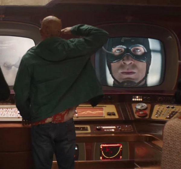 Wade Wilson luôn là fan cứng Steve Rogers. Thế nên, chẳng có gì ngạc nhiên khi anh ta vào tư thế chào khi thấy hình ảnh Steve được TVA chiếu trên màn hình.
