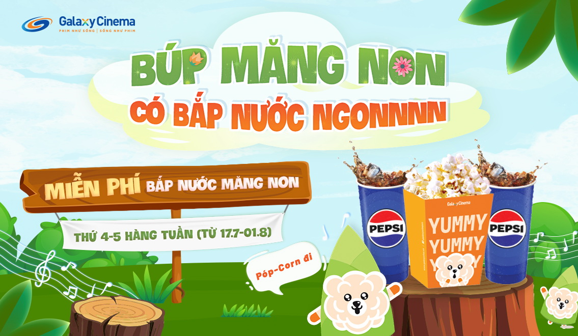 Từ 17.07 đến 01.08.2024, vào thứ 4 & thứ 5 mỗi tuần, Galaxy Cinema tặng bắp nước MIỄN PHÍ cho các búp măng non chơi hè!