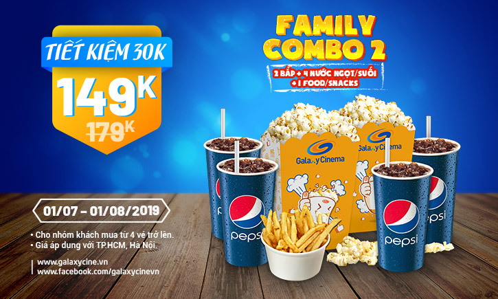 - Tại các cụm rạp Galaxy Cinema của Tp. Hồ Chí Minh và Hà Nội: Family Combo 2 có giá 149k (Trước đó là 179k).