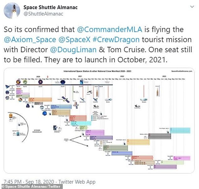 Cụ thể mới đây, tài khoản twitter của Space Shuttle Almanac đã tung ra một thời gian biểu về lịch trình du hành vào Trạm vũ trụ Quốc tế trong vòng 3 năm tới. Theo đó, Tom Cruise và đạo diễn Doug Liman sẽ bay lên vũ trụ trên tàu con thoi Axiom Space Crew Dragon thuộc sở hữu công ty Space X cùng nhà du hành vũ trụ Michael López-Alegría.